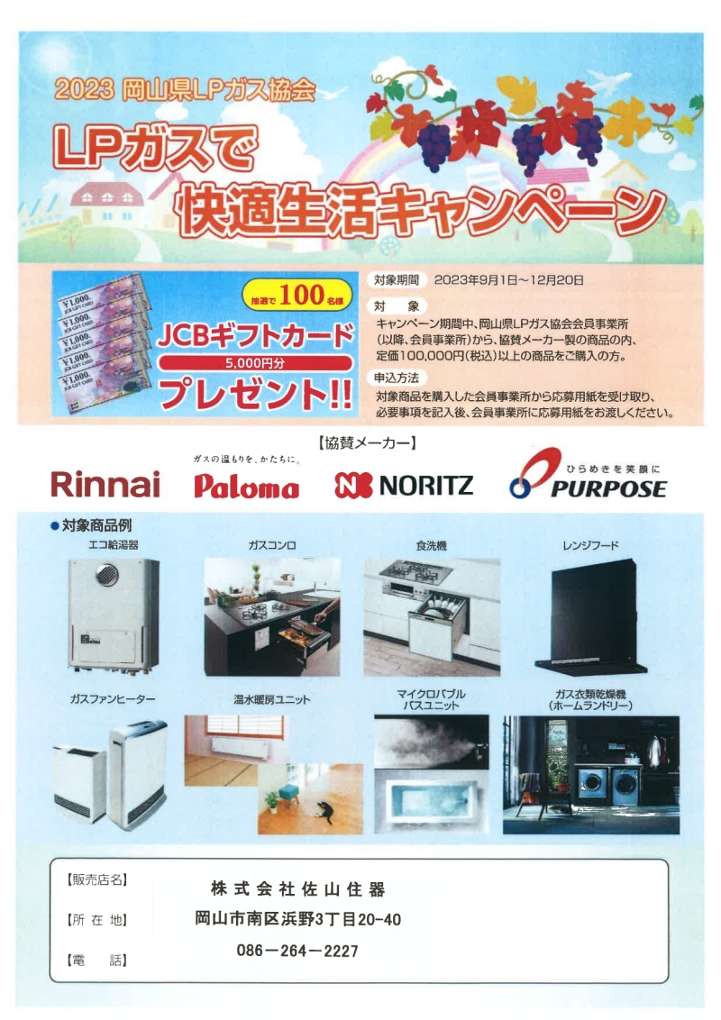 キャンペーン期間中、岡山県LPガス協会会員事業所から、協賛メーカー製の商品の内、